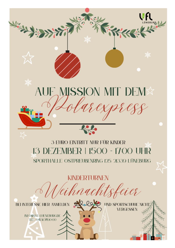 dieses Jahr besucht uns wieder der Weihnachtsmann bei unserer Kinderweihnachtsfeier. Es ist jeder herzlich Willkommen, egal ob Mitglied, Freund, Verwandte oder Nachbar. Wir haben für euch wieder einen großen Parkour vorbereitet, den ihr auf Mission mit dem Polarexpress durchlaufen könnt.